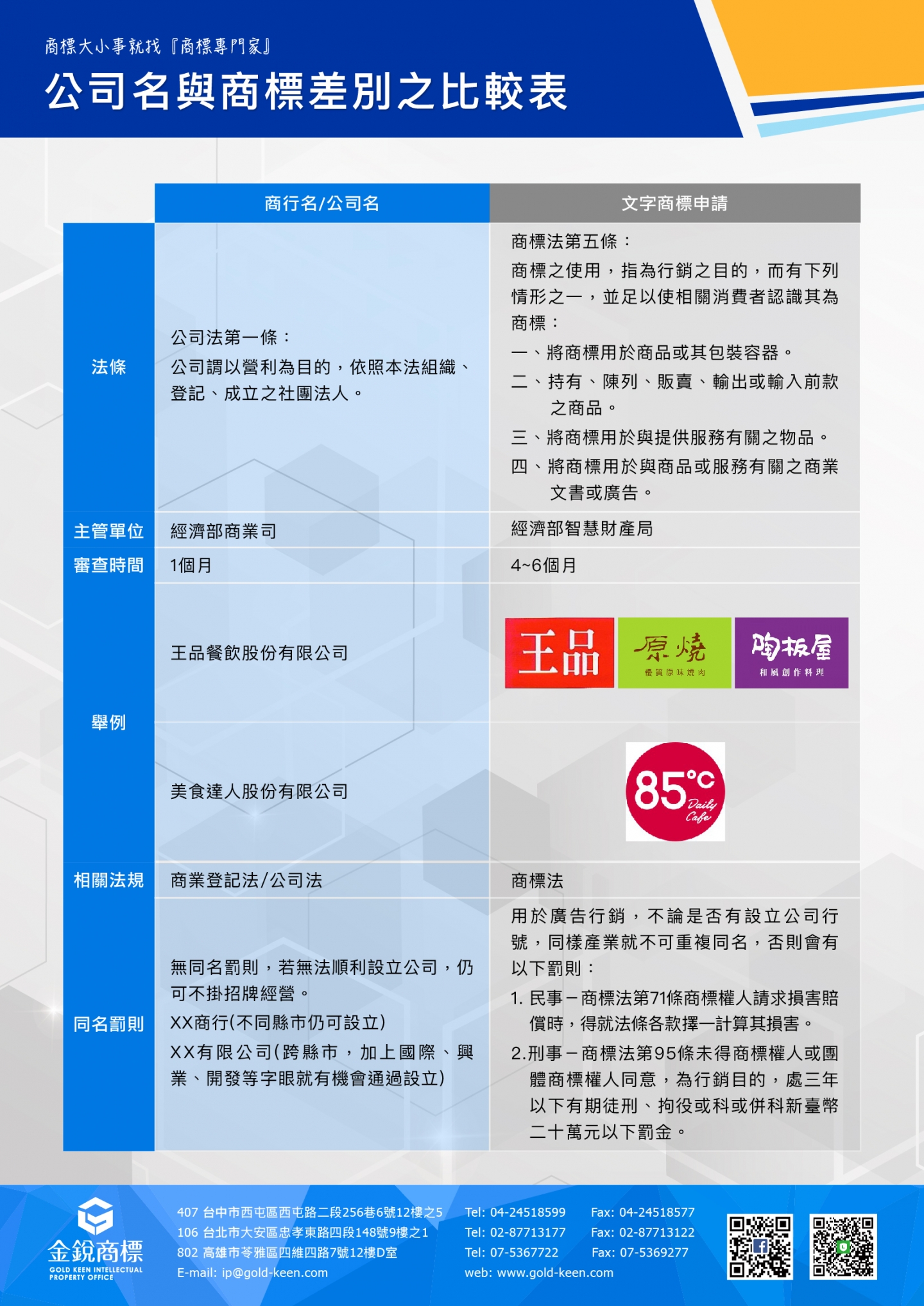 其實,公司名稱主要用來識別營業主體,並確保法律行為及權利義務歸屬的主體相同。而商標,則是表彰商品或服務的來源,故公司名稱與商標兩者的意義、功能及法規都不相同,所以並不會互相影響或限制!依目前政府規定,公司名稱(含商行)登記是由經濟部商業司主管,適用《公司法》;而商標申請則是由經濟部智慧財產局(簡稱智財局)作為主管單位,適用《商標法》,具體可參考下方差異表。
