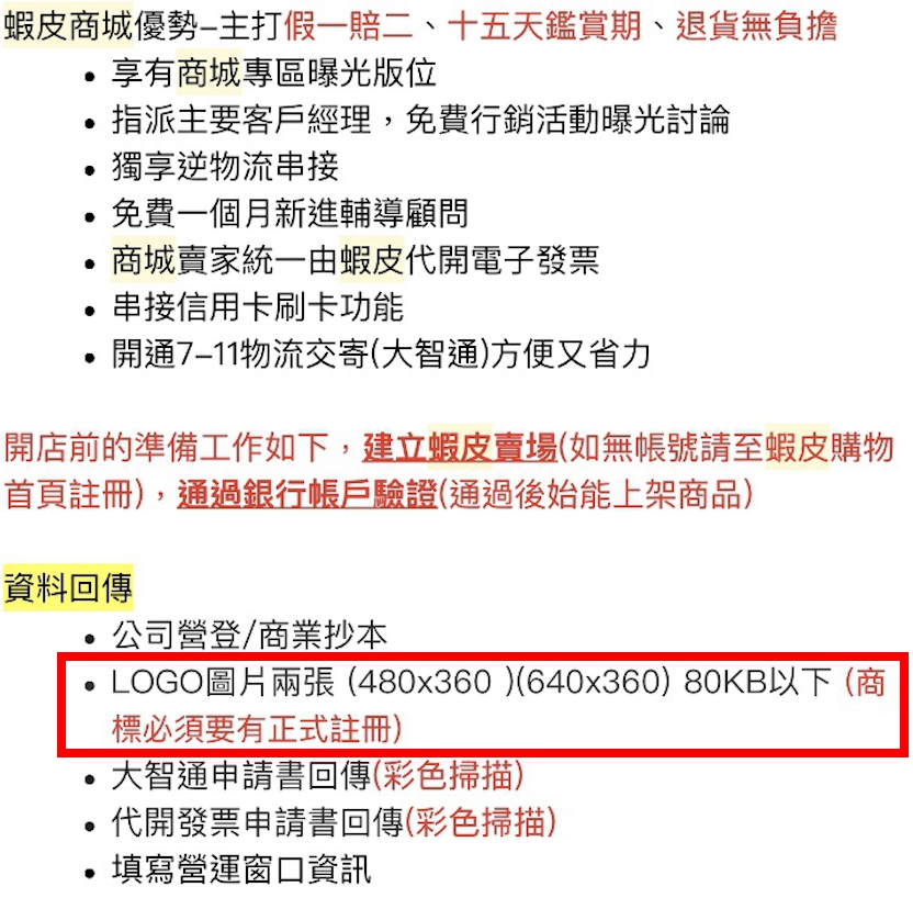 如:台灣網購平台蝦皮購物是東南亞及台灣首屈一指的電子商務平台,其蝦皮商城又主打“假一賠二、十五天鑑賞期、退貨無負擔”,這個優勢讓消費者和業者都紛紛轉往商城。但要入駐商城,其中就有明確規定:「Logo圖片兩張(商標必須要有正式註冊)」,這也就表示如果你沒有商標權將無法入駐各知名網購平台。